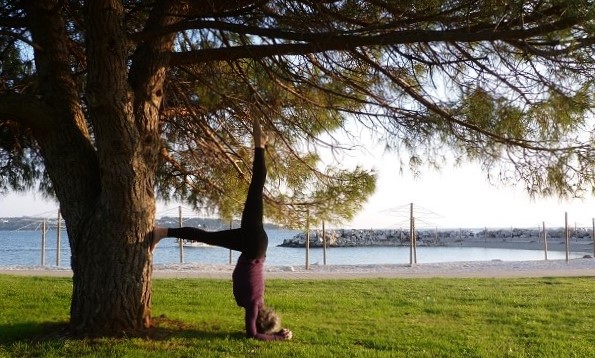 Nach ein paar Sonnengrüßen und Asanas zum Aufwärmen und Kräftigen der Schultermuskulatur suchen wir uns Bäume im Umfeld und helfen einander mit dieser Variation der Umkehrhaltung.